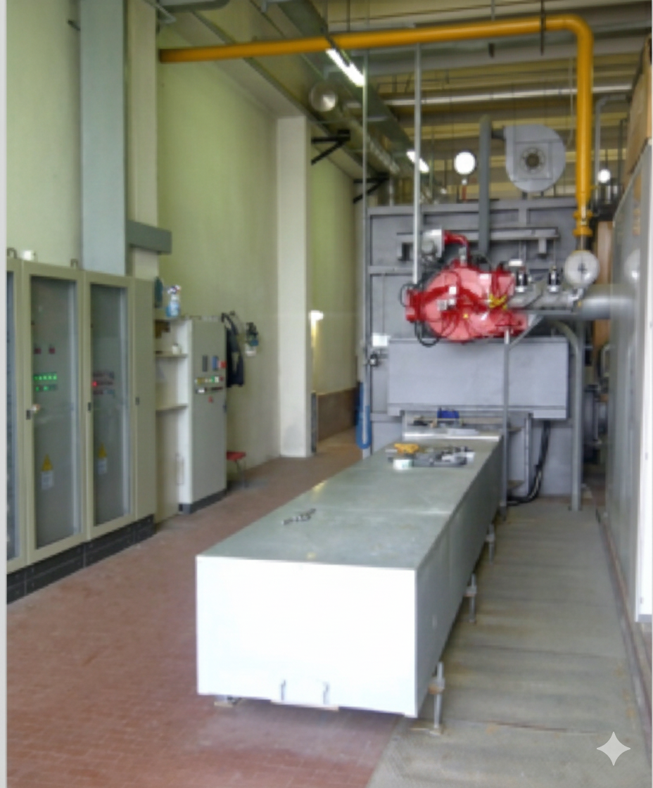 For this application, a 6 MW wood powder burner plant was designed and commissioned, integrated with a 20 m³ combustion chamber (combustor).